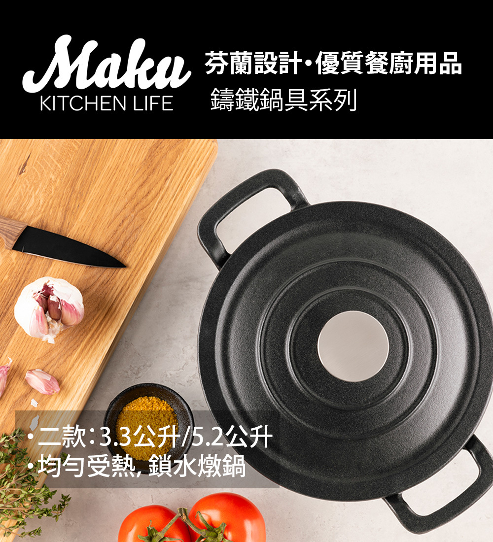 鑄鐵鍋非常適合烹飪需要長時間悶煮的食物,蓋子上的冷凝凸點產生雨林效應,使水份均勻地回到食物上。霧面琺瑯是鑄鐵的一種保護處理,可以防止鍋子生鏽,保護鑄鐵表面。共有二款可供選擇:容量 3.3L以及5.2L,適用所有爐灶,可進烤箱最高耐熱溫度350度。