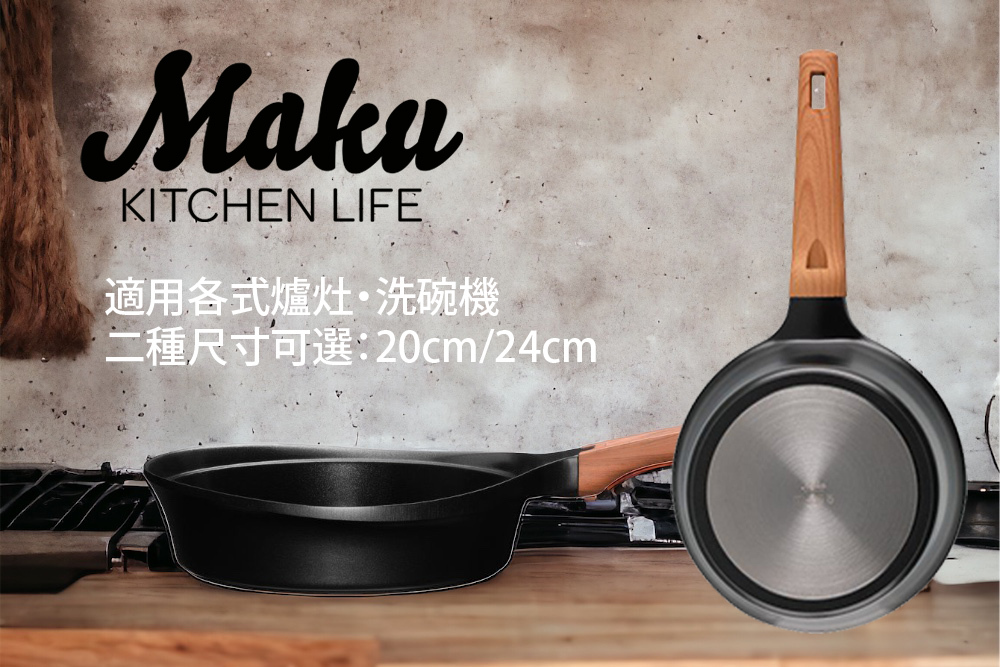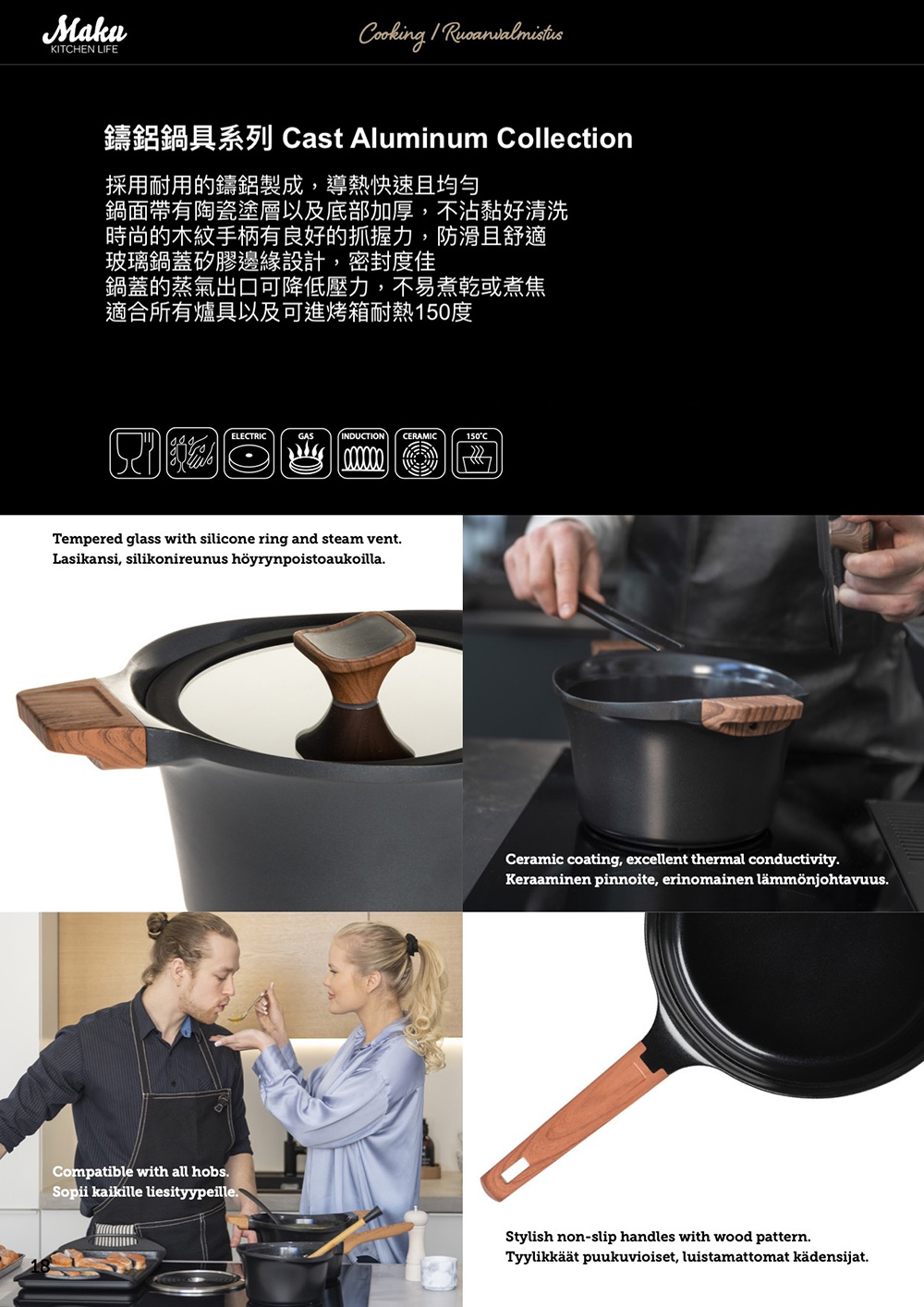 平底煎鍋採用耐用的鑄鋁製成,良好均勻的導熱效果,鍋面具有陶瓷塗層,底座加厚 5mm設計,烹煮時不沾黏,木紋防滑手柄提供良好的抓握力,分別有20cm,容量1.3公升以及24cm,容量2公升平底鍋可供選擇,適用所有爐灶以及烤箱最高溫度150度。