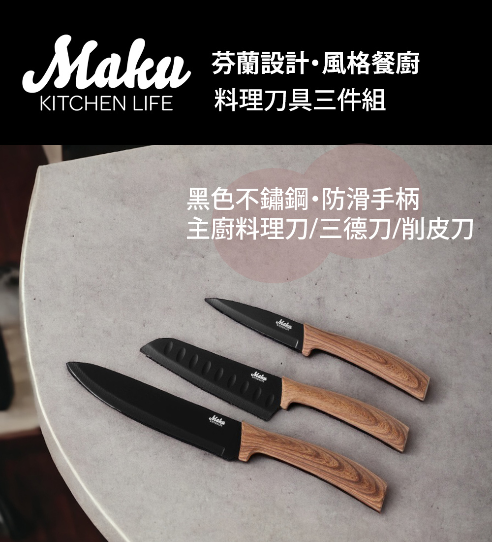 一套漂亮耐用的刀具,刀刃為黑色不銹鋼,手柄設計防滑 TPR 塗層,仿木色系。整套內含:29公分主廚料理刀、23公分三德刀以及20公分削皮刀。