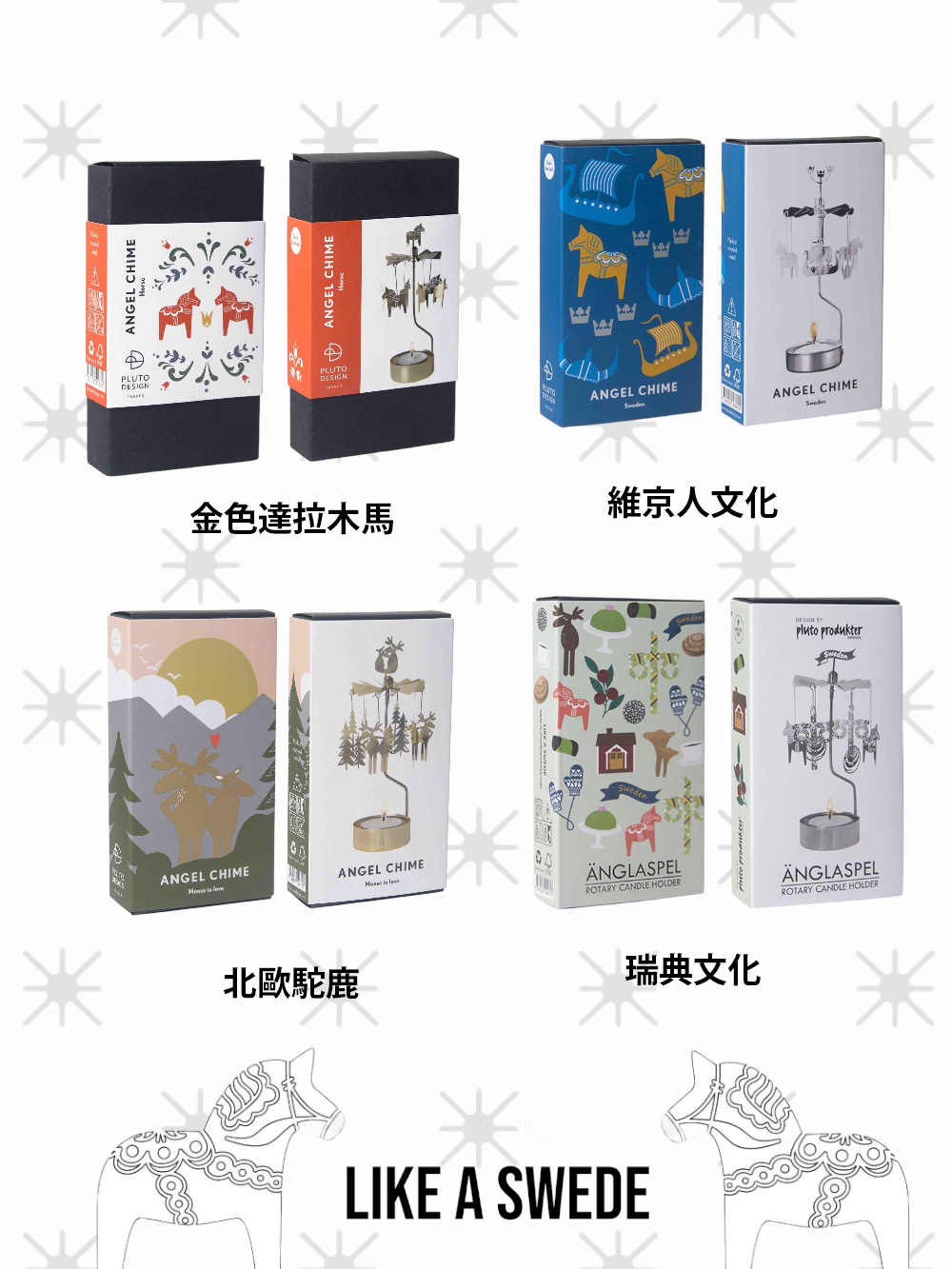 代表北歐的經典動物駝鹿,在森林裡的樹林間生活,搭配金色燭台,駝鹿與森林裡的樹木化身為可愛的吊飾,藉由熱能飛舞旋轉,最療癒可愛的送禮小物。