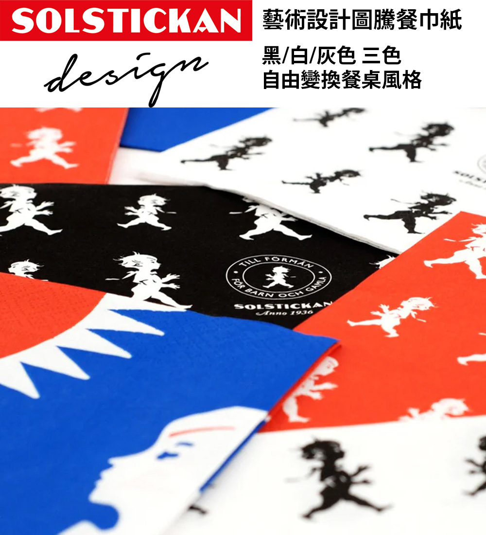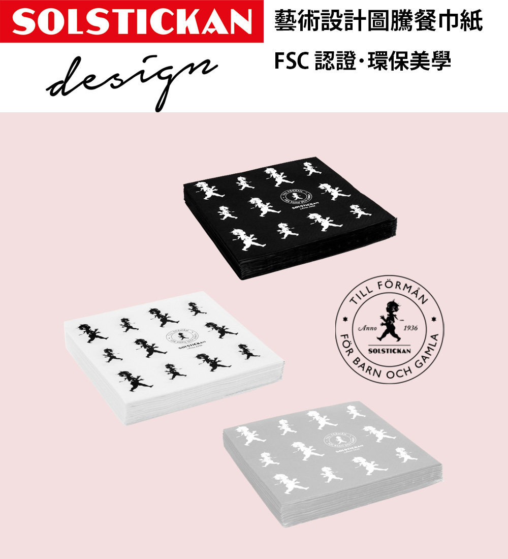帶有男孩重複圖案的餐巾紙, Einar Nerman 於 1936 年創作的經典男孩圖騰,結合了餐巾紙的設計,重覆規則排列的圖案,個性設計感十足,為餐桌擺飾提升至另一個層次的精美配件。餐巾紙採用FCS 認證的紙張,兼具環保概念,共有三黑/白/灰三色可供選擇。
